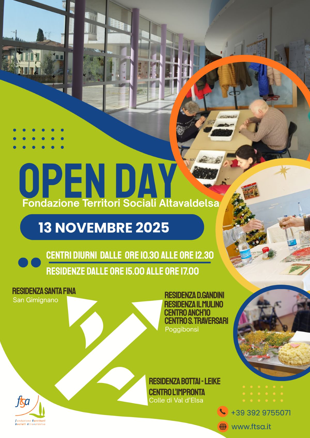 La Fondazione Territori Sociali Altavaldelsa, nella giornata di giovedì 13 novembre, apre a tutta la cittadinanza i suoi i centri diurni e le sue strutture residenziali per persone con disabilità e per persone anziane.